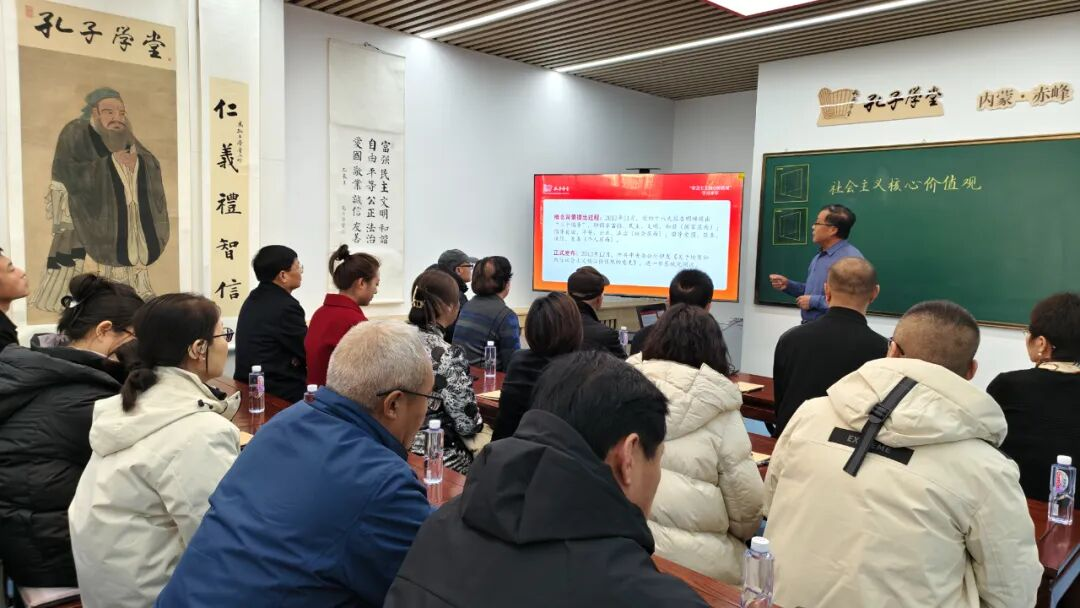 在与会嘉宾的共同瞩目下,赤峰龙行美楷文化传媒有限公司董事长黄凤东与宁晓山主任共同为“孔子学堂”揭牌,红绸缓缓揭开,“孔子学堂”四个黑色大字熠熠生辉,现场掌声雷动。这块牌匾承载着先贤智慧与文化理想,彰显新时代赤峰人的文化自信,宣告以经典育人、以文化润城的新征程正式启航。挂牌仪式圆满落幕,学堂薄正元老师随即开讲第一课,深入浅出解读社会主义核心价值观,将传统美德与时代精神有机融合,让现场嘉宾在经典浸润中感悟文化力量,为学堂文化教化使命写下生动开篇。